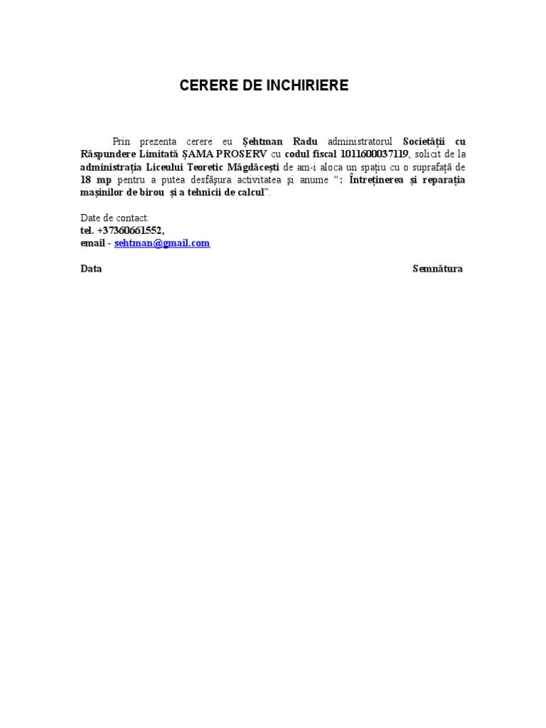Model Cerere Inchiriere Spatiu