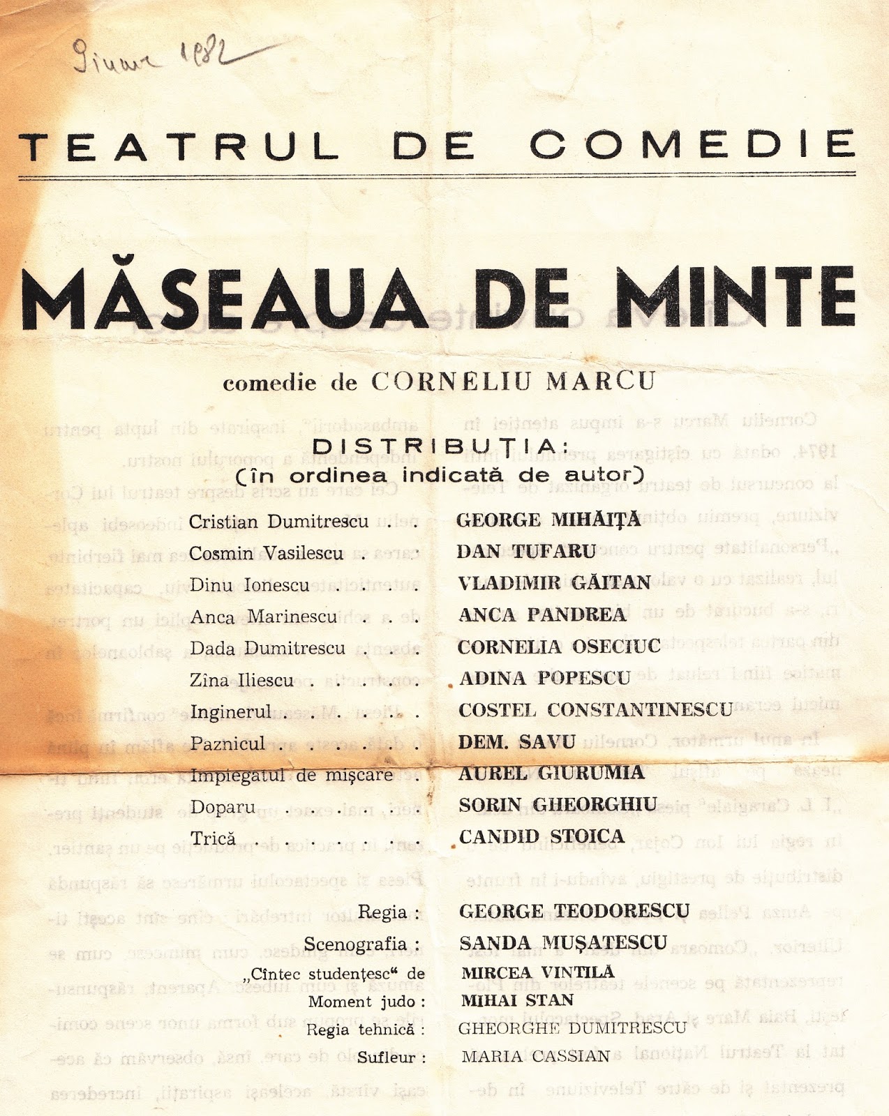 Program De Sala Teatrul De Comedie Bucuresti 1982 Maseaua De Minte De Corneliu Marcu Altmarius
